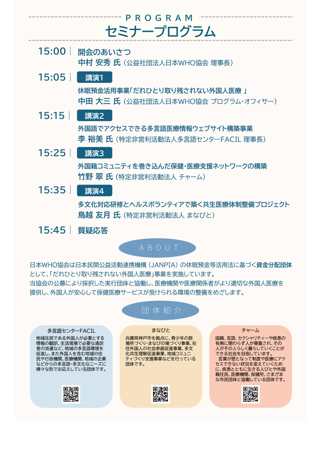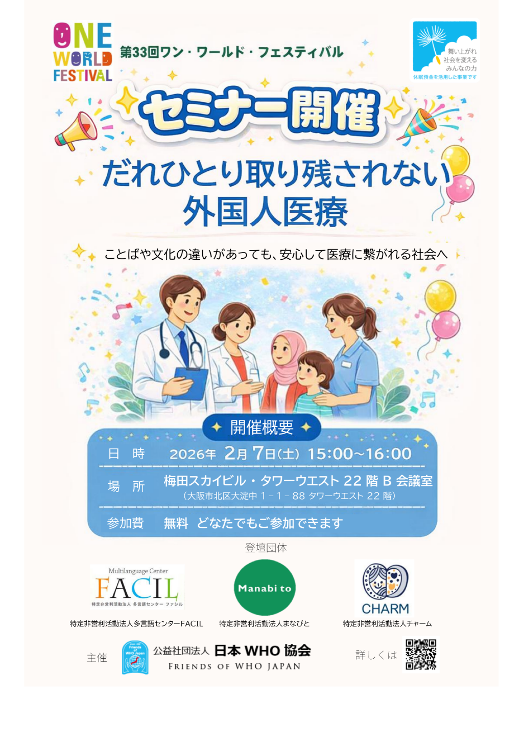 2025年10月より、日本WHO協会が行っている休眠預金活用事業『だれひとり取り残されない外国人医療』の実行団体の一つとして選定されたことをお知らせします。