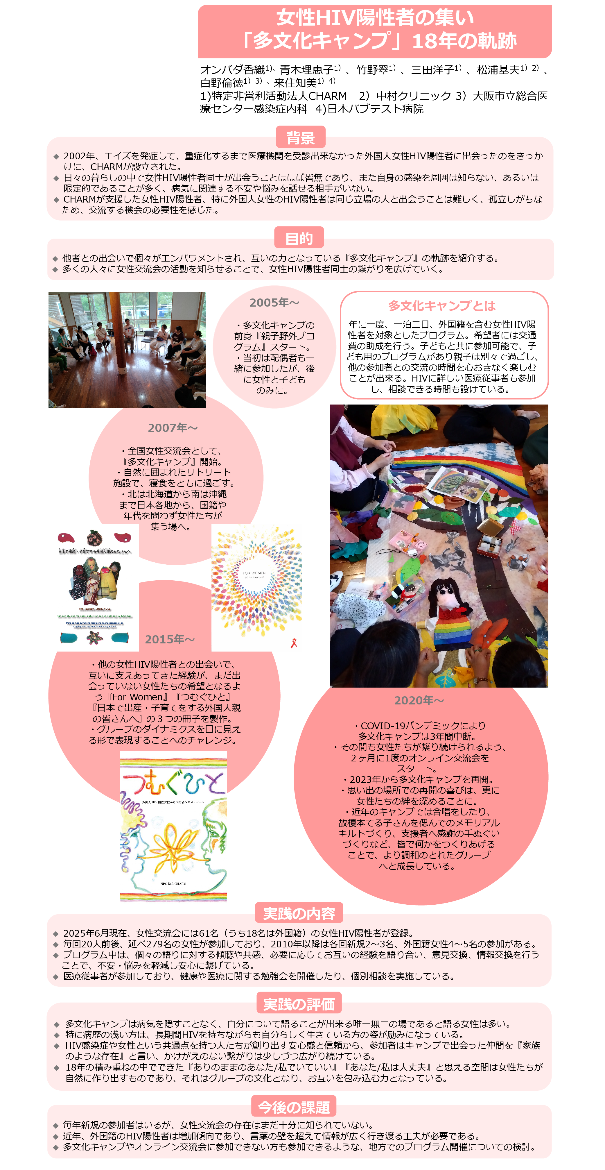 また、今年は「女性HIV陽性者の集い-『多文化キャンプ』18年の軌跡-」「日本に移住するHIV陽性者が治療を継続するための実践」という2つのテーマでポスター発表を行いました。ありがたいことに移住者支援についての発表では2年連続優秀演題賞をいただくことができました。どちらのポスターも多くの人に足を止めて見ていただき、CHARMが20年間コツコツと積み上げてきた活動をみなさんに知っていただく良い機会にすることができたと思います。