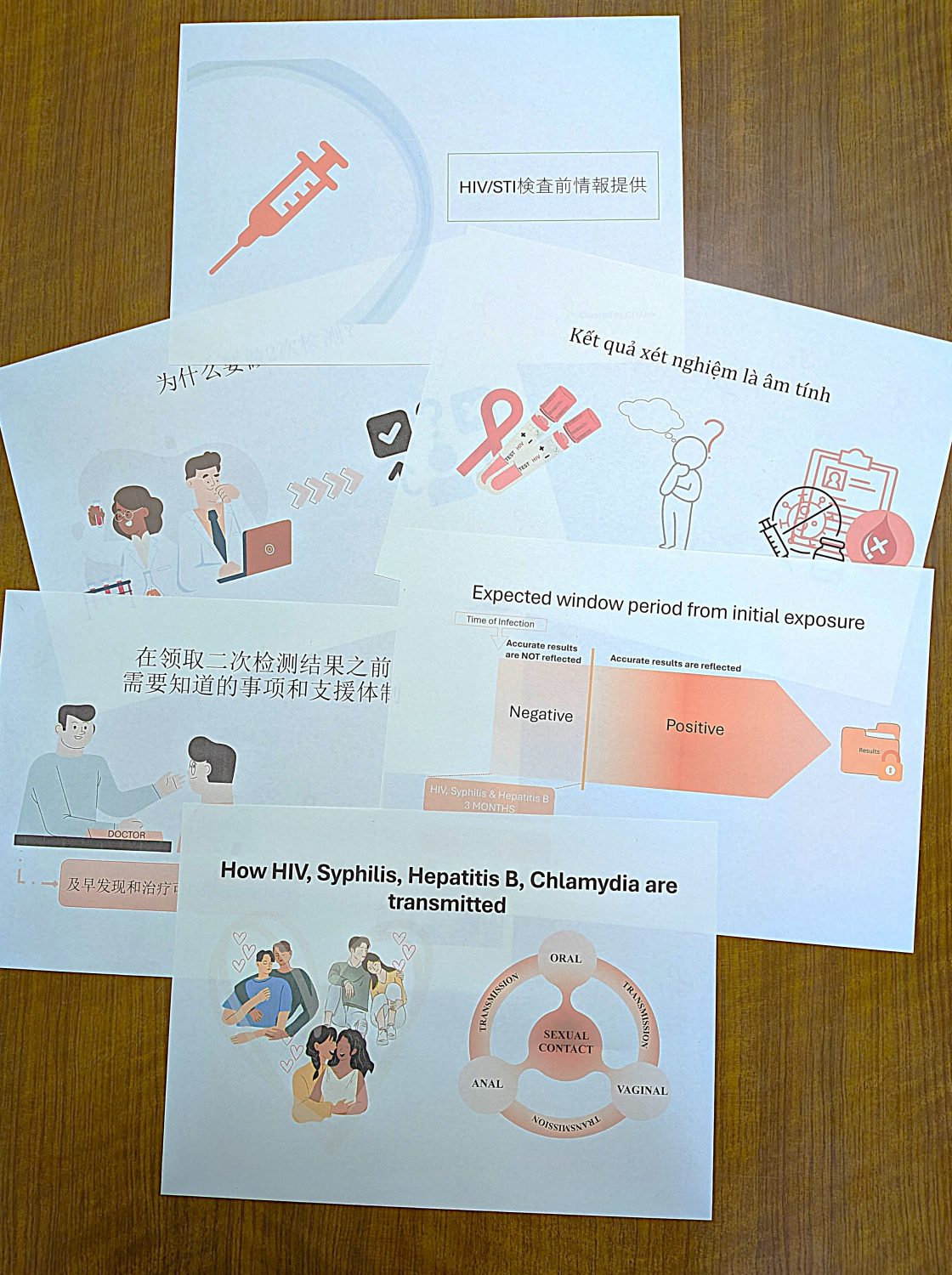 誰でも罹患する可能性がある性感染症は、定期的検査を受けることが感染予防行動の一つとして重要です。大阪府下の保健所でも無料匿名でHIV/STI(性感染症)の検査を行っています。若い年齢層の多い外国籍住民は検査への関心が高く、保健所等で検査を受けたいけれど言葉がわからないという問題があります。受け入れる側も医療通訳体制がない中で外国人受検者の対応には苦労が伴います。自治体では必要な資料を外国語に翻訳して配布し、翻訳機を駆使して意思疎通をしています。CHARMは、2025年度から大阪市/府委託の検査会場で試験実施している多言語受検情報動画を8言語で作成して保健所等と相談しながら、大阪府下31ヶ所の検査会場で活用することを目指します。来場者が自分の携帯で動画を見ることで検査前後に必要な情報を得て、HIV受診時には医療通訳が同行できる体制を構築します。